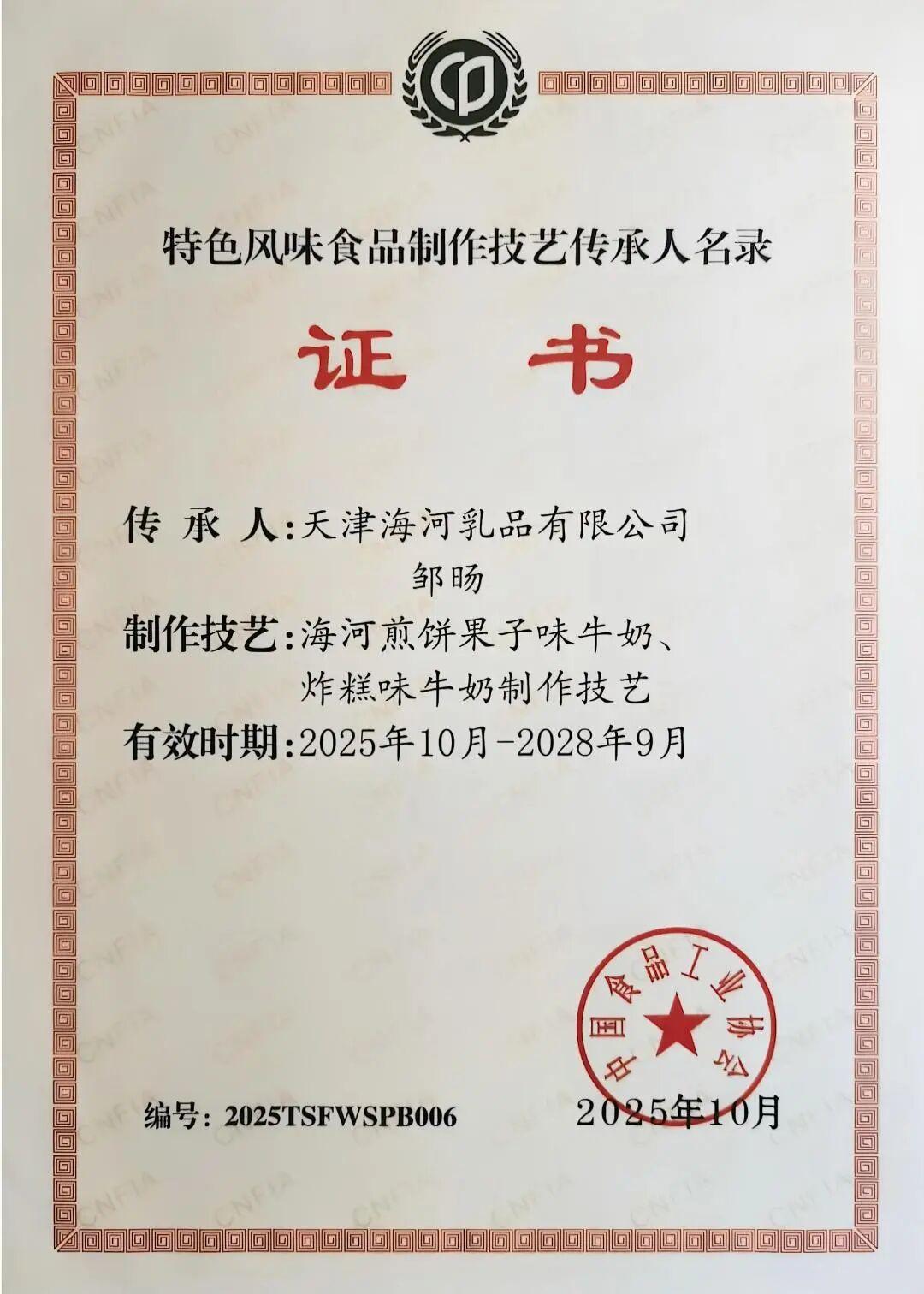 近日,中國食品工業(yè)協(xié)會公布第二批“特色風(fēng)味食品標(biāo)志性產(chǎn)品、制作技藝傳承人名錄”。海河乳品公司黨委書記、董事長鄒旸榮獲“特色風(fēng)味食品制作技藝傳承人”稱號。煎餅果子味牛奶、炸糕味牛奶榮膺“特色風(fēng)味食品標(biāo)志性產(chǎn)品”。這一由國家行業(yè)權(quán)威組織、經(jīng)專家多輪評審認(rèn)定的成果,標(biāo)志著海河乳品公司在傳承與創(chuàng)新地域特色食品、推動傳統(tǒng)風(fēng)味現(xiàn)代化轉(zhuǎn)型方面走在了行業(yè)前列,為老字號品牌注入了強(qiáng)勁動能。